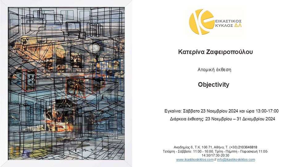 Ο Εικαστικός Κύκλος ΔΛ σε συνεργασία με την ΔΛ Gallery παρουσιάζει το Σάββατο 23 Νοεμβρίου 2024 την ατομική έκθεση της Κατερίνας Ζαφειροπούλου με τίτλο «Objectivity».