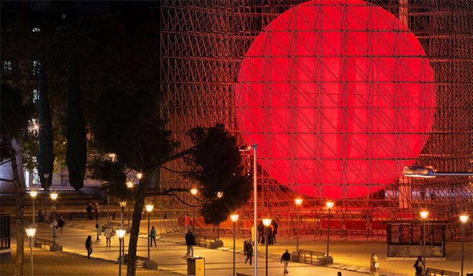 Στην Plaza de Colón της Μαδρίτης, ο καλλιτέχνης SpY παρουσιάζει μια εγκατάσταση που αποτελείται από μια φωτεινή κόκκινη σφαίρα εγκλωβισμένη σε μια κυβόσχημη δομή.