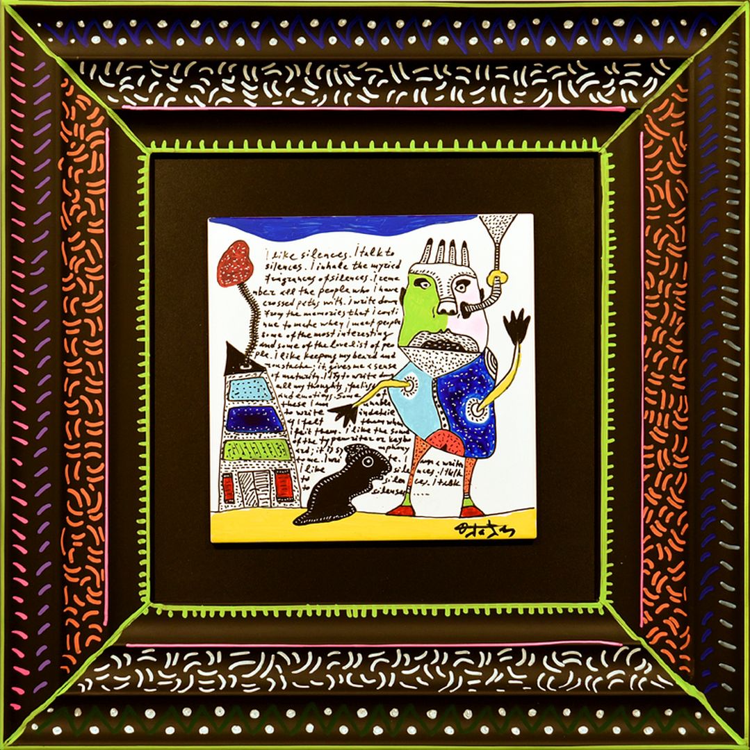 Aκρυλικό και μελάνι πάνω σε πορσελάνινο πλακάκι, επιζωγραφισμένη κορνίζα