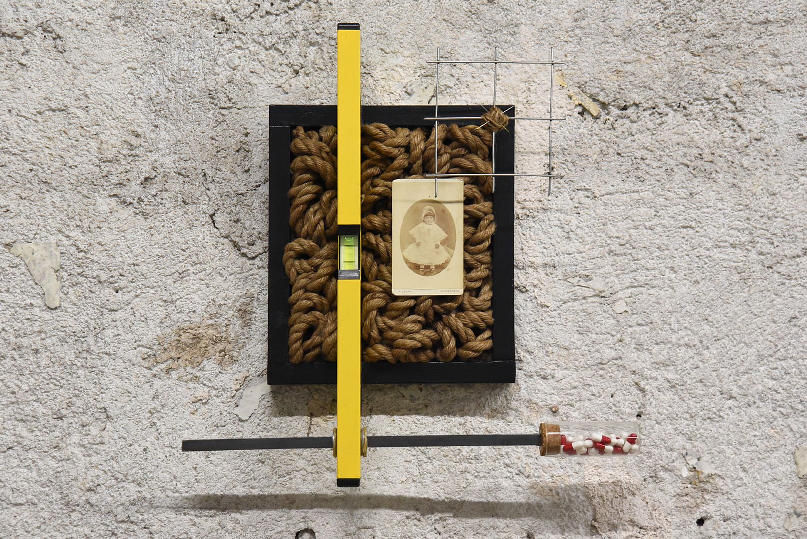 Χωρίς Τίτλο, 2021, Ξύλο, σκοινί γιούτας, σίδερο, χάπια, γυαλί,