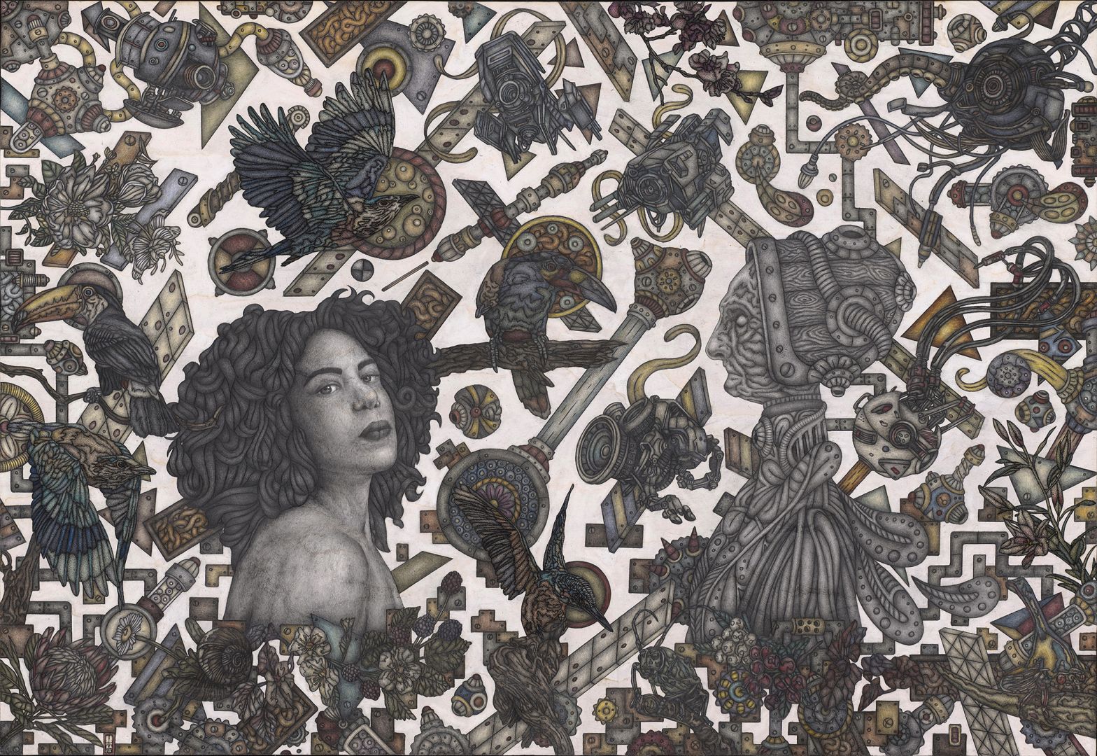 χρωματιστά μολύβια, μολύβι, και μελάνι σε χαρτί 2022-2023, με κορνίζα και μουσειακό τζάμι UV70
