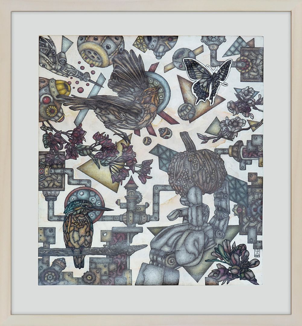 Μελάνι, μολύβι, χρωματιστά μολύβια σε χαρτί, με κορνίζα και μουσειακό τζάμι UV70