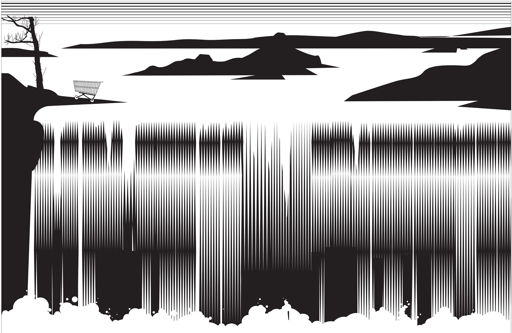 Περιγραφή: Το έργο καταρράκτης αποτελεί ένα οπτικό αφήγημα που δομείται με την συνύπαρξη δύο εντελώς ξένων μεταξύ τους στοιχείων. Τη στυλιζαρισμένη μεγαλοπρέπεια του φυσικού τοπίου ενός καταρράκτη και το εγκαταλειμμένο καρότσι του super market.
